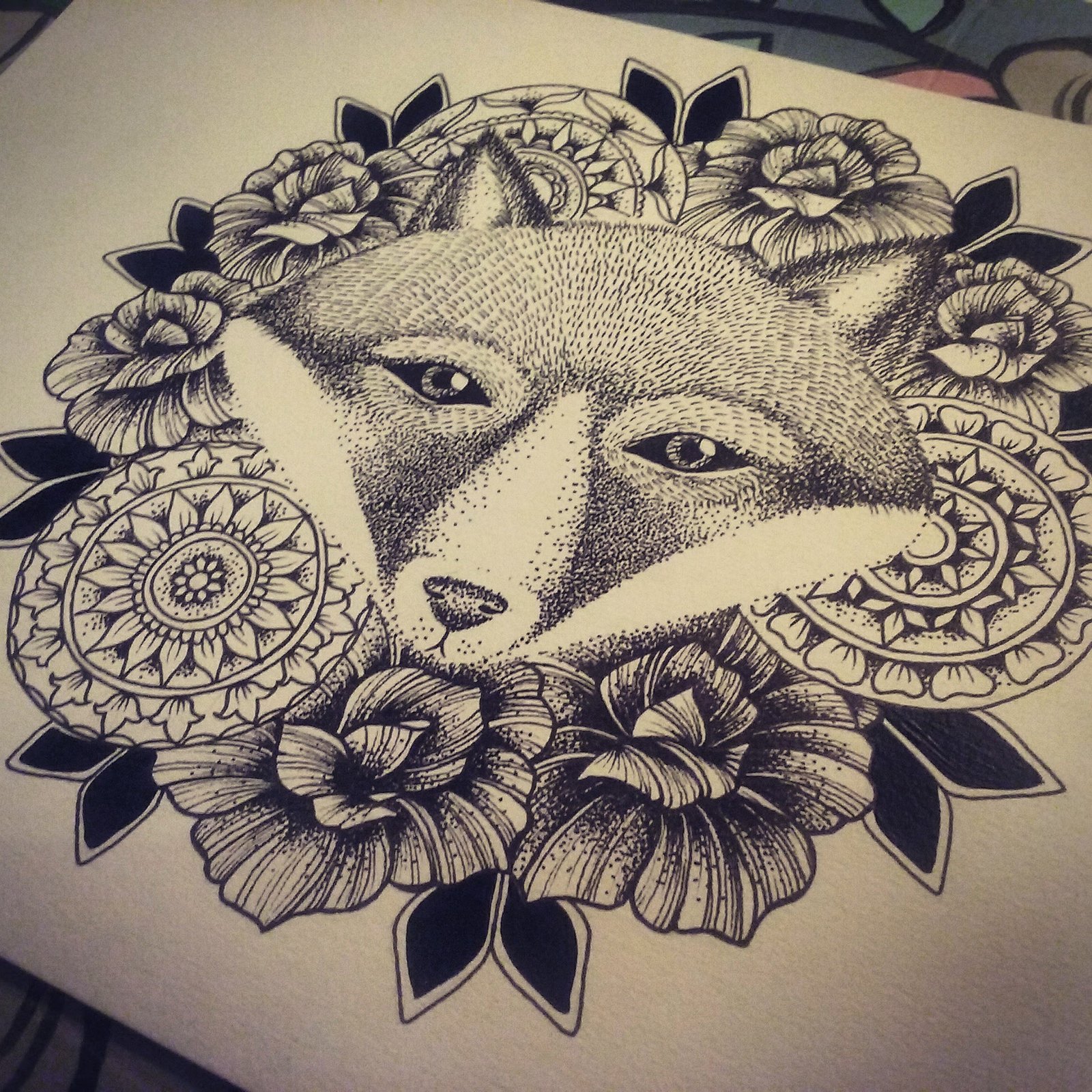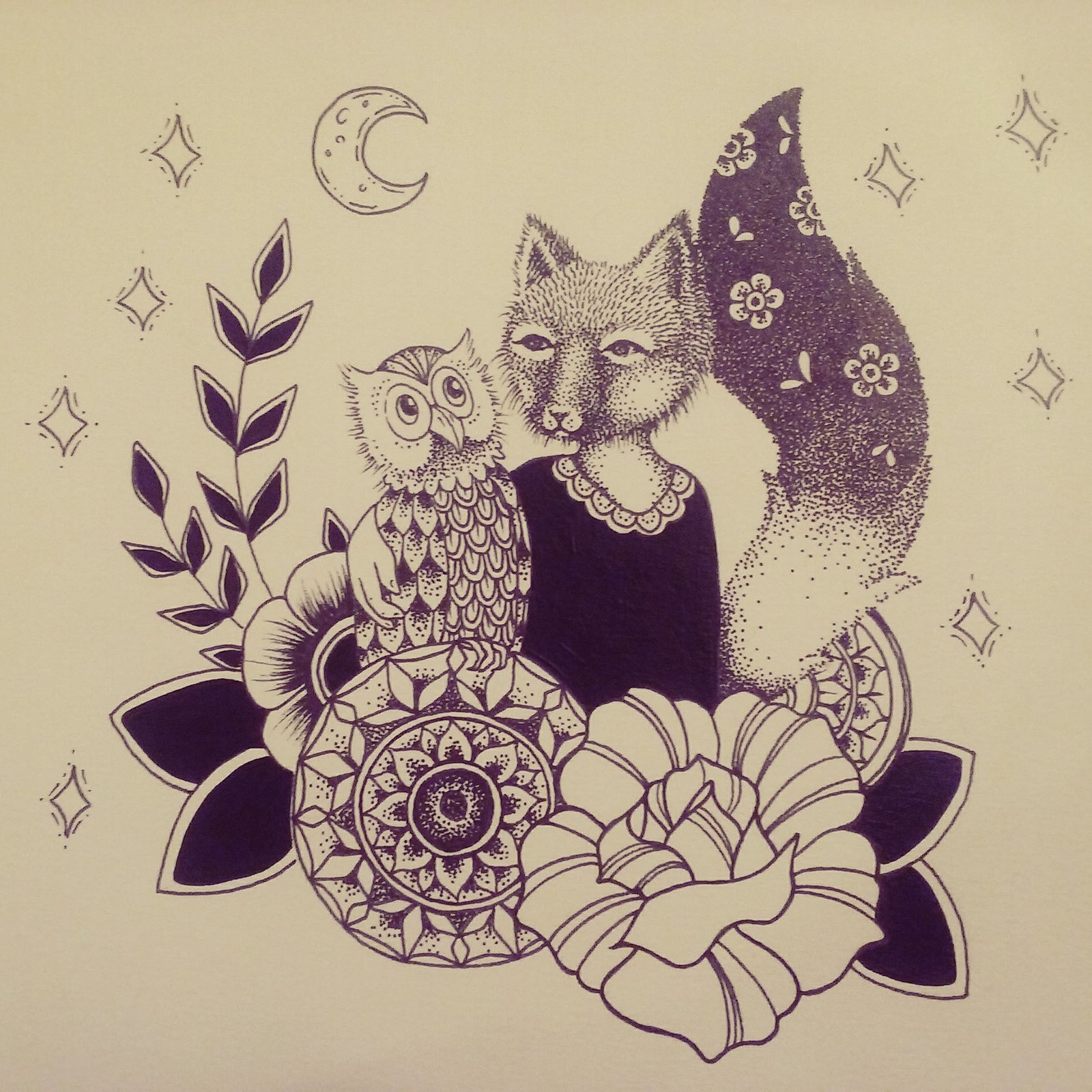 Cute design featuring an affectionate fox and an owl under the moon. Owl and Fox Tattoo Design. Owl Mandala Tattoo Design. Owl moon and fox tattoo design.